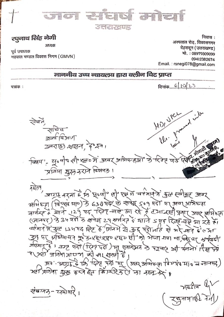 विकासनगर। जन संघर्ष मोर्चा अध्यक्ष एवं जीएमवीएन के पूर्व उपाध्यक्ष रघुनाथ सिंह नेगी ने सचिव,ऊर्जा आर मीनाक्षी सुंदरम से मुलाकात कर यूपीसीएल (उत्तराखंड पावर कॉरपोरेशन लि.) में अवर अभियंता (वि. एवं यां) के 129 पद तथा जानपद के 5 पद रिक्त पदों पर भर्ती प्रक्रिया शुरू करने को लेकर आग्रह किया,जिस पर मीनाक्षी सुंदरम ने एमडी, यूपीसीएल को प्रक्रिया शुरू करने के निर्देश दिए।