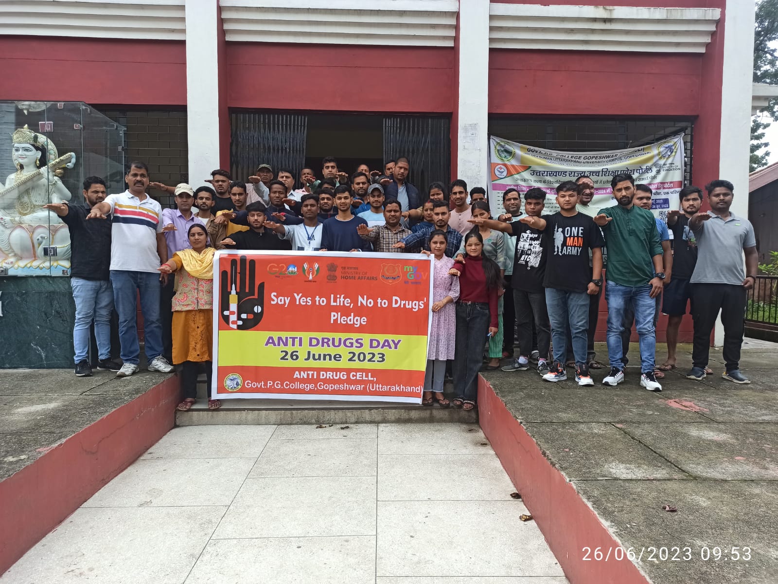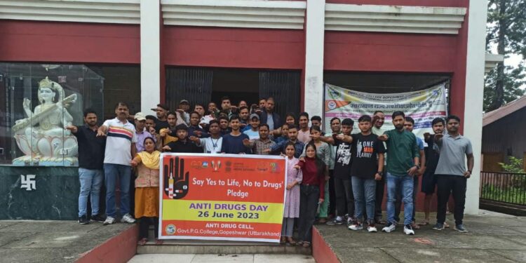 गोपेश्वर। 26 जून को राजकीय स्नातकोत्तर महाविद्यालय गोपेश्वर में एंटी ड्रग्स डे मनाया गया। तीलू रौतेली पुरस्कार से सम्मानित सामाजिक कार्यकर्ता श्रीमती मीना तिवारी ने छात्र छात्रात्रों को नशा मुक्ति अभियान के तहत ड्रग्स न लेने की शपथ दिलाई।