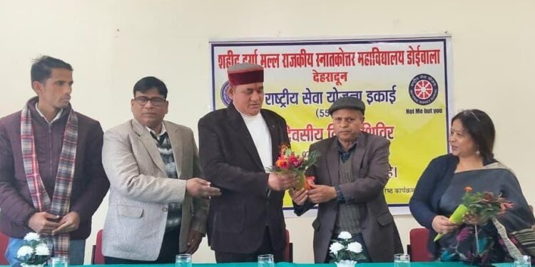 डोईवाला, (प्रियांशु सक्सेना)। शहीद दुर्गामल्ल पीजी कॉलेज, डोईवाला की राष्ट्रीय सेवा योजना (एनएसएस) इकाई के विशेष शिविर का शुभारंभ डोईवाला नगर पालिका अध्यक्ष नरेंद्र सिंह नेगी द्वारा किया गया। उन्होंने कहा कि विद्यार्थियों को शिक्षा के साथ-साथ संस्कार भी आत्मसात करने चाहिए, समाज को ऐसे ही जागरूक युवाओं की आवश्यकता है। कार्यक्रम अधिकारी डॉ. किरण जोशी ने बताया कि शिविर का मुख्य स्थल महाविद्यालय परिसर में रहेगा, जबकि चयनित कार्यस्थल राजीवनगर व आर्यनगर निर्धारित किया गया है। शिविर के दौरान स्वच्छता, आपदा प्रबंधन, पर्यावरणीय जागरूकता, डिजिटल सुरक्षा, स्वास्थ्य एवं स्वच्छता जैसे महत्वपूर्ण विषयों पर विभिन्न गतिविधियां आयोजित की जाएंगी। जिसमें लगभग 50 से 60 स्वयंसेवक भाग ले रहे हैं। प्रभारी प्राचार्य प्रो नवीन नैथानी ने शिविर की मूल भावना को विद्यार्थियों के समक्ष रखा। डॉ. शिव लाल ने शिविर जीवन के महत्व पर प्रकाश डाला। डॉ. राखी पंचोला ने एनएसएस लक्ष्य गीत की विशेषताओं पर प्रकाश डाला। वही, योगाचार्य अमित नेगी ने शिविर में योग के महत्व की जानकारी दी।
