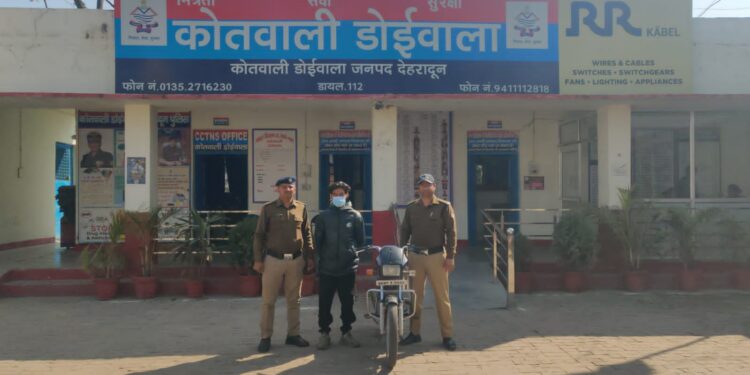 डोईवाला, (प्रियांशु सक्सेना)। मियांवाला चौक से चोरी हुई मोटरसाइकिल का पुलिस ने 12 घंटे के भीतर खुलासा करते हुए आरोपी को गिरफ्तार कर लिया। हर्रावाला चौकी प्रभारी रघुवीर सिंह कपरवान के अनुसार, 19 फरवरी को भगवती प्रसाद निवासी गुजरोवाली, थाना रायपुर ने कोतवाली डोईवाला में तहरीर देकर बताया कि उनकी मोटरसाइकिल मियांवाला चौक से अज्ञात व्यक्ति द्वारा चोरी कर ली गई है। तहरीर के आधार पर मुकदमा दर्ज किया गया। कोतवाली प्रभारी निरीक्षक प्रदीप राणा ने बताया कि पुलिस टीम ने घटनास्थल और आसपास के क्षेत्रों के सीसीटीवी फुटेज खंगाले तथा मुखबिर तंत्र को सक्रिय किया। 20 फरवरी की रात हर्रावाला बैरियर पर चेकिंग के दौरान अर्जुन थापा निवासी शिवलोक कॉलोनी, रायपुर को चोरी की मोटरसाइकिल के साथ गिरफ्तार कर लिया गया। उन्होंने बताया कि अभियुक्त का पूर्व में भी आपराधिक इतिहास रहा है। पूछताछ में आरोपी ने नशे की लत के चलते चोरी की घटना को अंजाम देना स्वीकार किया। वह चोरी की मोटरसाइकिल को बेचने की फिराक में था, लेकिन उससे पहले ही पुलिस ने उसे दबोच लिया।