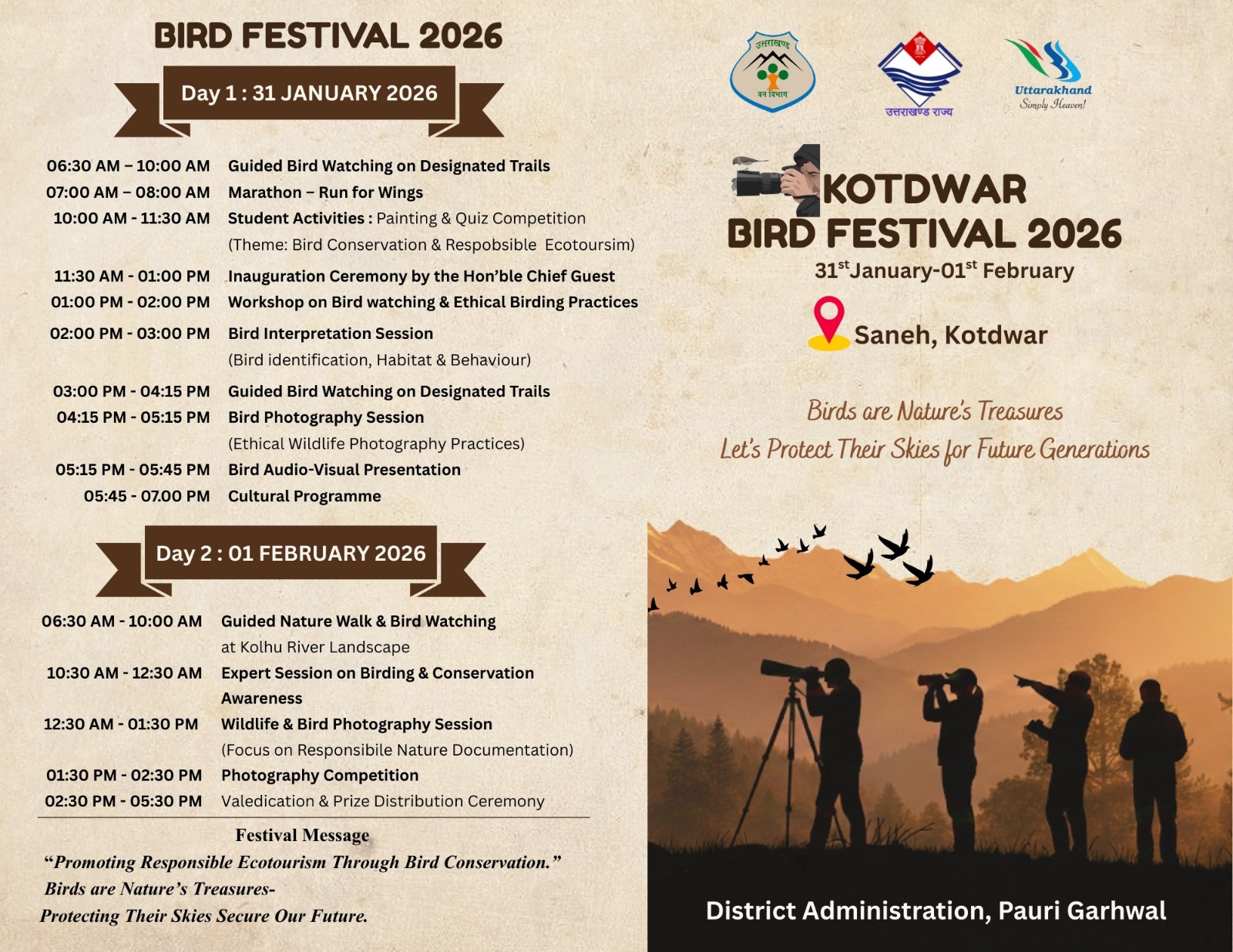 कोटद्वार के सनेह क्षेत्र में आगामी 31 जनवरी एवं 1 फरवरी को आयोजित होने वाले दो दिवसीय बर्ड फेस्टिवल की तैयारियों को लेकर जिलाधिकारी स्वाति एस. भदौरिया ने जिला कार्यालय स्थित एनआईसी कक्ष में संबंधित विभागीय अधिकारियों के साथ बैठक कर व्यवस्थाओं की समीक्षा की। उन्होंने अधिकारियों को निर्देश दिए कि सभी तैयारियां समय पर पूर्ण की जाएं और इस आयोजन को भव्य स्वरूप दिया जाए।