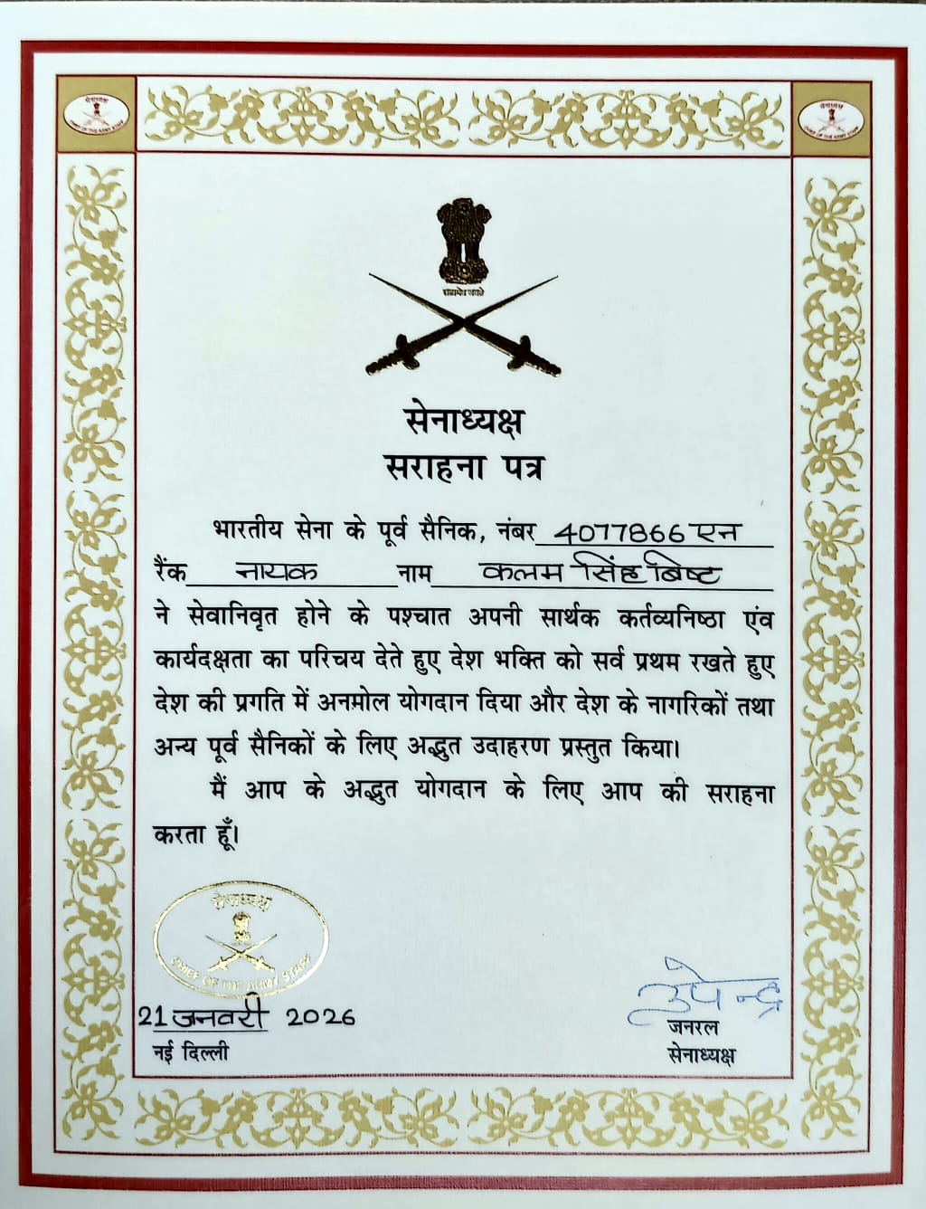 चमोली जिले के पूर्व नायक कलम सिंह बिष्ट को सेना की ओर से जनरल उपेंद्र द्विवेदी ने एक समारोह में बुधवार की देर सांय सेना मुख्यालय दिल्ली में उनके द्वारा समाज के उत्थान के लिए किए गए कार्यों के लिए सेना की ओर से सम्मानित किया। इस मौके पर जनरल ने नायक बिष्ट का पीठ थपथपाते हुए उनके द्वारा समाज हित में किए गए और किए जा रहे कार्यों की सराहना करते हुए कहा कि बिष्ट के द्वारा अल्ट्रा रनिंग में उपलब्धियां सेना के हरेक जवान के लिए एक उदाहरण पेश कर रहा है।इस मौके पर जनरल ने उन्हें समाज के लिए और बेहतरीन कार्य करने की शुभकामनाएं भी दी। “सेनाध्यक्ष ने नायक बिष्ट को सौंपे सराहना पत्र में कहा है कि पूर्व सैनिक बिष्ट ने सेवानिवृत्त के बाद सार्थक कर्ताव्यनिष्ठा एवं कार्यदक्षता का परिचय देते हुए देश भक्ति को सर्वप्रथम रखते हुए देश की प्रगति में अनमोल योगदान दिया हैं और देश के नागरिकों एवं पूर्व सैनिकों के लिए अद्भुत उदाहरण प्रस्तुत किया।