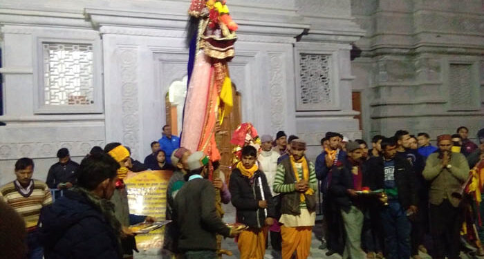 फोटो- नृसिंह मंदिर मठांगण में जाख देवता का स्वागत करते लोग।