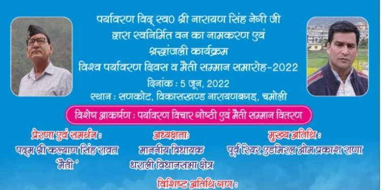 पद्मश्री कल्याण सिंह रावत मैती ने बताया कि अपने संसाधनों से सणकोट गांव में एक बड़े जंगल की स्थापना करने वाले एवं राज्य के प्रसिद्ध पर्यावरणविद् स्व० नारायण सिंह नेगी की प्रथम पूर्ण स्मृति पर उन्हें श्रद्धांजलि अर्पित करने के लिए ग्रामीणों ने सणकोट में 5 जून विश्व पर्यावरण दिवस के मौके पर पर्यावरण के संरक्षण को बढ़ावा देने के लिए कार्यक्रम आयोजित किया गया हैं। इस कार्यक्रम में पूर्व रियर एडमिरल ओम प्रकाश राणा बतौर मुख्य अतिथि शिरकत करेंगे। जबकि इस कार्यक्रम की अध्यक्षता थराली के विधायक भूपाल राम टम्टा करेंगे।