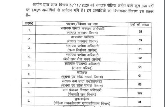 अधीनस्थ सेवा चयन आयोग के सचिव संतोष बडोनी के हस्ताक्षरों से जारी विज्ञप्ति के अनुसार सहायक समाज कल्याण अधिकारी, छात्रावास अधीक्षक, सहायक समीक्षा अधिकारी, सहायक चकबंदी अधिकारी, संवीक्षक, संरक्षक कम डाटा इंटी आपरेटर, ग्राम पंचायत विकास अधिकारी, सुपरवाइजर, मैटनकेयर सह हास्टल इंचार्ज, सहायक स्वागती, सहायक प्रबन्ध उद्योग, ग्राम विकास अधिकारी के कुल 854 पदों के लिए आवेदन आमंत्रित किए गए हैं। साथ एक नोट भी लगाया गया है कि पदों की संख्या कम हो सकती है या बढ़ भी सकती है। आवेदक आयोग की वेबसाइट www.sssc.uk.gov.in पर आवेदन कर सकते हैं।