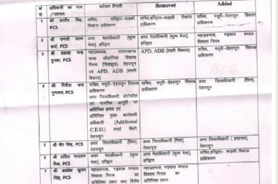 पीसीएस अधिकारी रामजी शरण शर्मा को अपर मेलाधिकारी हरिद्वार कुंभ से स्थानांतरित कर महाप्रबंधक गढ़वाल मंडल विकास निगम के पद पर स्थानांतरित किया गया है। पीसीएस अधिकारी गिरीश चंद्र गुणवंत से सचिव मसूरी-देहरादून विकास प्राधिकरण की जिम्मेदारी वापस लेकर उन्हें अपर जिलाधिकारी वित्त देहरादून के पद पर स्थानांतरित किया गया है। पीसीएस अधिकारी वीर सिंह को अपर जिलाधिकारी वित्त देहरादून के पद से स्थानंातरित कर अपर जिलाधिकारी प्रशासन देहरादून बनाया गया है।