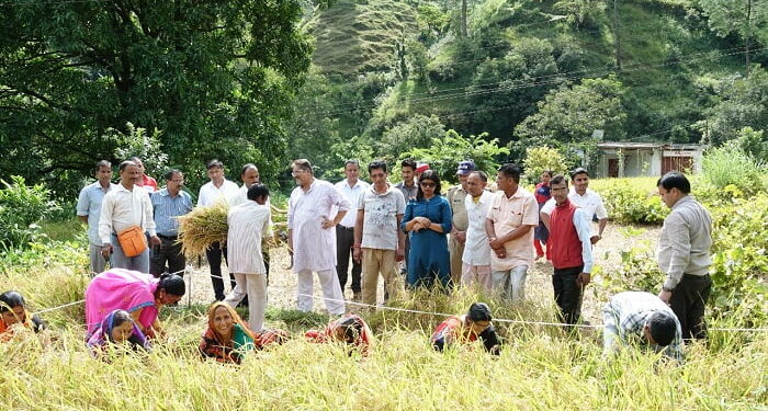 बागेश्वर। जिलाधिकारी रंजना राजगुरू ने आज ग्राम गढिया गांव में कृषक नारायाण दत्त पांडे के खेत में पहुंचकर क्राप कटिंग की। कृषि एवं सांख्यकीय विभाग द्वारा गढिया गांव के निवासी नारायाण दत्त पांडे के खेत में 30 वर्ग मीटर का प्लॉट बनाकर नियमानुसार सी.सी.ई. एग्री एप के माध्यम से क्राप कटिंग के लिए चिन्हित किया गया था। जिसमें जिलाधिकारी ने 30 वर्ग मीटर के प्लॉट में महिलाओं के साथ धान कटाई की। क्राप कटिंग के दौरान निर्धारित खेत से कुल 13.1 किग्रा धान प्राप्त हुआ।