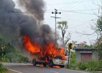 बाला सुंदरी मंदिर के पास टेंपो ट्रैवलर में लगी आग, यात्रियों ने कूदकर बचाई जान, सामान भी जलकर हुआ ख़ाक