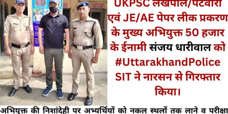 पटवारी और एई जेई भर्ती परीक्षा पेपर लीक प्रकरण में फरार चल रहे 50 हजार के इनामी भाजपा के पूर्व मंडल अध्यक्ष व वर्तमान में प्रधान प्रतिनिधि मौहम्मदपुर निवासी संजय धारीवाल को एसआईटी ने नारसन से गिरफ्तार कर लिया है। आरोपी के कब्जे से 4.25 लाख और दो ब्लैंक चेक बरामद हुए हैं। जबकि अभ्यर्थियों को नकल वाले स्थान और परीक्षा केंद्र तक लाने, ले जाने में इस्तेमाल वाहन को भी कब्जे में लेते हुए सीज कर दिया है।