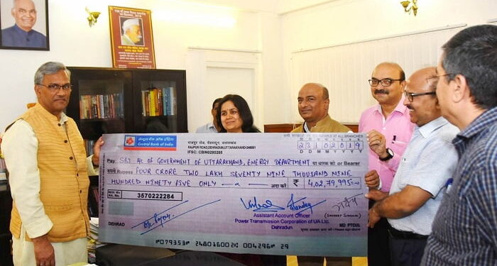 देहरादून। मुख्यमंत्री श्री त्रिवेन्द्र सिंह रावत से शुक्रवार को अध्यक्ष पिटकुल एवं सचिव ऊर्जा श्रीमती राधिका झा ने भेंट कर पिटकुल की लाभांश राशि के रूप में रू0 4,02,79,995-/(चार करोड़ दो लाख उनासी हजार नौ सौ पिच्चानवे रूपये) की धनराशि का चैक भेंट किया।