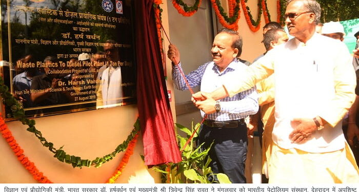 देहरादून। विज्ञान एवं प्रौद्योगिकी मंत्री, भारत सरकार डाॅ. हर्ष वर्धन एवं मुख्यमंत्री श्री त्रिवेन्द्र सिंह रावत ने मंगलवार को भारतीय पेट्रोलियम संस्थान, देहरादून में अपशिष्ट प्लास्टिक से डीजल प्रायोगिक संयंत्र का उद्घाटन किया। इस संयंत्र में एक टन प्लास्टिक कचरे से 800 लीटर डीजल बनेगा। इस संयंत्र की स्थापना से वेस्ट मैटीरियल का जहां डीजल के रूप में सदुपयोग होगा, वहीं प्लास्टिक से मुक्ति की दिशा में भी अच्छा कदम है।