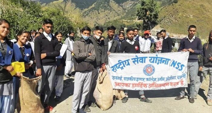 फोटो- उर्गम मे स्वच्छता/जागरूकता अभियान चलाते एनएसएस के स्वयं सेवी।