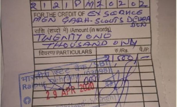गढवाल स्काउटस पूर्व सैनिक अध्यक्ष श्री नेगी ने बताया कि स्काउटस परिवार के सदस्यो सूबेदार मेजर/आनरी कैप्टन हंसा दत्त सती, शिशुपाल सिंह खत्री, महिपाल ंिसह नेगी, सूबेदार पुष्कर सिहं चैहान, गंगा सिह, आरएस नेगी, व मकर ंिसह सहित अनेक सदस्यो के सहयोग से धनराशि एकतित्रत कर पीएम केयर फंड मे प्रेषित की गई।