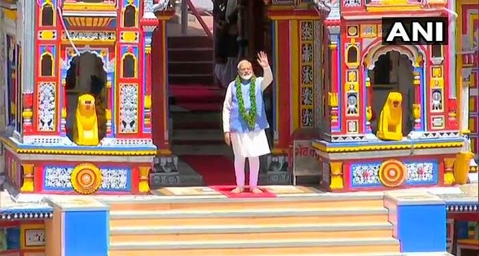 01–भगवान बदरीविशाल की पूजा के बाद सिंहद्वार से लोगो का अभिवादन करते पीएम मोदी।