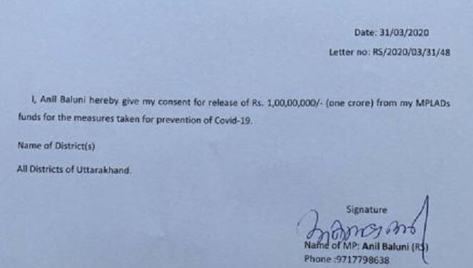 उत्तराखंड से राज्यसभा सांसद और भारतीय जनता पार्टी के राष्ट्रीय मीडिया प्रमुख श्री अनिल बलूनी ने अपनी सांसद निधि से एक करोड़ रुपये की राशि और अपने एक माह का वेतन प्रधानमंत्री राहत कोष हेतु प्रदान किया है। उन्होंने कहा कि इस राशि का उपयोग उत्तराखंड प्रदेश में कोविड-19 कोरोना से राहत के कार्यों में खर्च होगा।