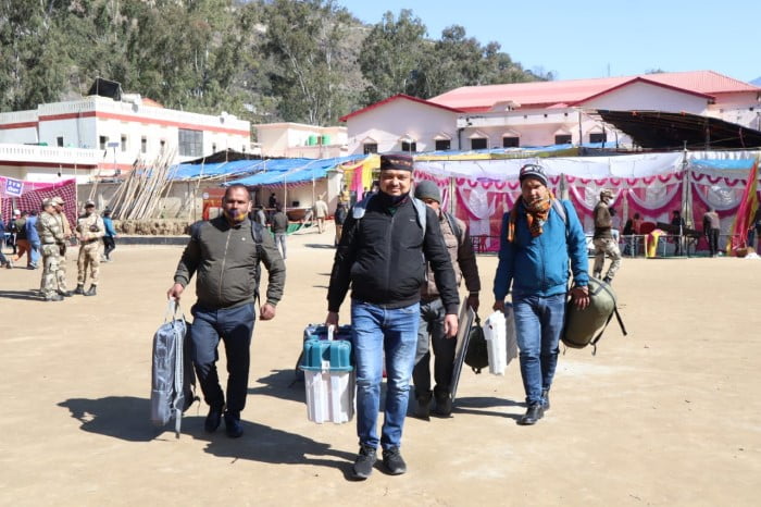अगस्त्यमुनि क्रीड़ा परिसर से विधान सभा केदारनाथ की दूरस्थ क्षेत्रों की 11 पोलिंग पार्टियों जिसमें मतदेय स्थल त्रिजुगीनारायण, तोषी, चिलौण्ड, गौंडार, जग्गी बगवान, बेडुला, कुणजेठ, ब्यूंखी, गणेशनगर, पिल्लू एवं गुगली तथा विधान सभा रुद्रप्रयाग की 07 पोलिंग पार्टियों को जिसमें मतदेय स्थल स्यूर, स्यूर चमाचैरी, घंघासू बक्सीर, बक्सीर, उच्छोल, डांगी खोड बांगर व भुनालगांव बूथों की पोलिंग पार्टियों को उनके गंतव्य के लिए रवाना किया गया। पोलिंग पार्टियों को ईवीएम मशीन उपलब्ध कराए जाने के लिए सामान्य प्रेक्षक की निगरानी में प्रातः 07 बजे स्ट्रंग रूम खोला गया तथा ईवीएम मशीनों को कड़ी सुरक्षा के बीच निकाली गई। निर्वाचन सामग्री वितरण किए जाने हेतु रिटर्निंग आफिसर केदारनाथ एवं रिटर्निंग आफिसर रुद्रप्रयाग की ओर से पृथक.पृथक काउंटर बनाए गए जिसमें रवाना की गई पोलिंग पार्टियों को निर्वाचन सामग्री, ईवीएम एवं वीवीपैट मशीनें उपलब्ध कराई गई। पोलिंग पार्टियों को सुरक्षा बलों के साथ उनके गंतव्य के लिए रवाना किया गया।