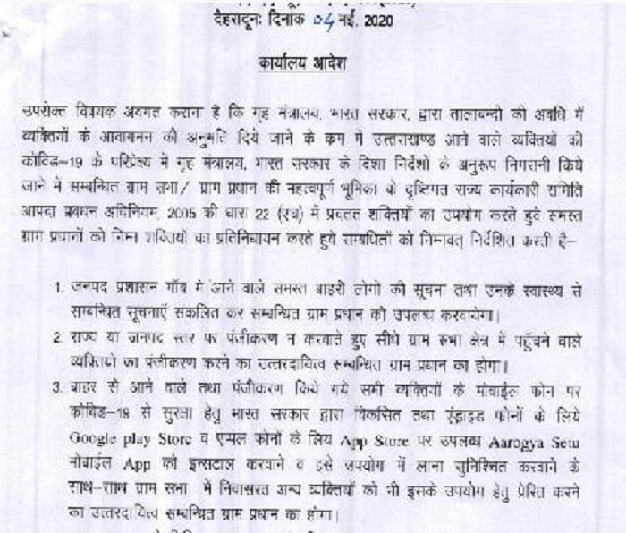 मुख्य सचिव उत्पल कुमार सिंह ने 9 बिंदुओं वाला एक कार्यालय आदेश जारी किया है। जिसकी प्रस्तावना में कहा गया है कि भारत सरकार के गृह मंत्रालय ने तालाबंदी काल में लोगों के आवागमन की अनुमति दी है। कोविड-19 के परिप्रेक्ष्य में गृह मंत्रालय भारत सरकार के दिशा निर्देशों के अनुरूप निगरानी के कार्य में ग्राम प्रधानों की भूमिका महत्वपूर्ण हो गई है। ग्राम प्रधानों की भूमिका के दृष्टिगत राज्य कार्यकारी समिति आपदा प्रबंधन अधिनियम 2005 की धारा 22, एच में प्रदत्त शक्तियों का उपयोग करते हुए समस्त ग्राम प्रधानों पर शक्तियां प्रतिनिधानित करती है।