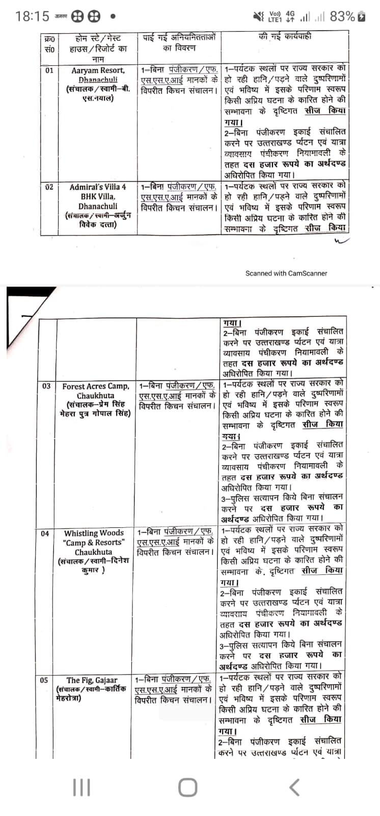 मुख्यमंत्री श्री पुष्कर सिंह धामी के निर्देशों पर उत्तराखण्ड में विभिन्न गेस्ट हाउस और रिज़ॉर्ट पर प्रशासन की ताबड़तोड़ कार्रवाई शुरू हो गई है। मुख्यमंत्री धामी के निर्देश पर नैनीताल जिले के धानाचूली क्षेत्र में 5 रिजॉर्ट को सील किया गया है। जिला प्रशासन द्वारा शनिवार को विभिन्न होमस्टे एवं रिज़ॉर्ट की जाँच की गई, तय मानकों में खामियां पाए जाने पर जिलाधिकारी के निर्देशों पर एक ही दिन में 5 रिज़ॉर्ट को सील किया गया है।
