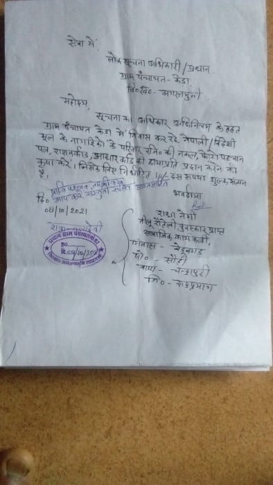 रूद्रप्रयाग जनपद, ऊखीमठ तहसील अन्तर्गत ग्राम पंचायत केड़ा में एक नेपाली परिवार का राशन कार्ड, आधार कार्ड, फोटो पहचान पत्र होने की खबर है, सूचना का अधिकार के तहत लोक सूचना अधिकारी से दि 8.10.2021 को परिवार रजिस्टर सहित उपरोक्त अभिलेखों की माँग की गयी, पहले तो प्रधान ने प्राप्ति में ही तहकीकात के निर्देश दिये और अग्रसारित करने की बात की।