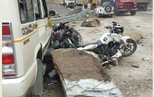 01- अवरूद्ध स्थल पीपलकोटी में चटटान टूटने से क्षतिग्रस्त हुई दो वाइक ।