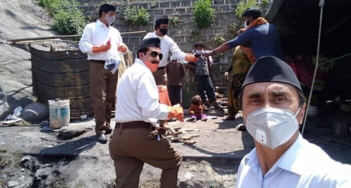फोटो- मास्क वितरण करते आरएसएस स्वयं सेवक।