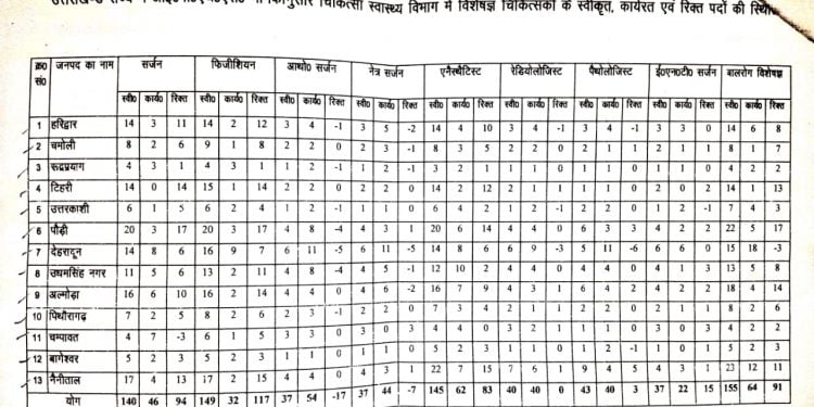 आंकड़ों के अनुसार उत्तराखंड राज्य में केवल एक फारेंसिक विशेषज्ञ देहरादून में उपलब्ध है, जबकि 25 पद राज्यभर में स्वीकृत हैं। देहरादून के अलावा राज्य के किसी भी जिले में फॉरेंसिक स्पेशलिस्ट नहीं है। इसी तरह राज्य में स्किन स्पेशलिस्ट के 32 पद स्वीकृत हैं, लेकिन सिर्फ 4 की ही नियुक्ति की गई है।