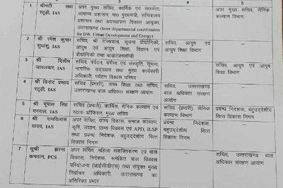 सचिव रमेश कुमार सुधांशु से सचिव आयुष एवं आयुष शिक्षा विभाग की जिम्मेदारी वापस ली गई है। दिलीप जावलकर को आयुष एवं आयुष शिक्षा विभाग की जिम्मेदारी सौंपी गई है। विनोद कुमार रतूड़ी से सचिव प्रभारी बाल संरक्षण आयोग की जिम्मेदारी वापस ली गई है। भूपाल सिंह मनराल से सचिव प्रभारी सैनिक कल्याण विभाग की जिम्मेदारी वापस ली गई है, जबकि उन्हें प्रबंध निदेशक बहुउद्देश्यीय वित्त विकास निगम की जिम्मेदारी सौंपी गई है। राम विलास यादव से प्रबंध निदेशक बहुउद्देश्यीय वित्त विकास निगम की जिम्मेदारी वापस ली गई है।