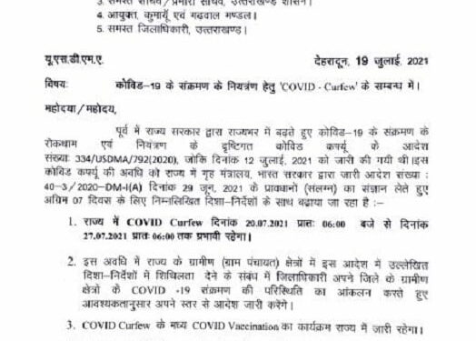 देहरादून। उत्तराखंड शासन ने कोविड कर्फ्यू सात दिन के लिए और बढ़ा दिया है। अब राज्य में 27 जुलाई सुबह 6 बजे तक कोविड कर्फ्यू जारी रहेगा।