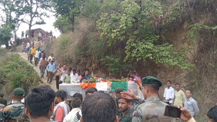 जम्मू.कश्मीर में एक सैन्य वाहन दुर्घटना में शहीद हुए सैनिक की देवाल स्थित पिंडर एवं कैल नदी के संगम स्थल त्रिवेणी घाट में गमगीन माहौल के बीच सैन्य एवं राजकीय सम्मान के साथ अंतिम संस्कार कर दिया गया है। इस दौरान सेना, पुलिस, प्रशासन के साथ ही तमाम जनप्रतिनिधि एवं क्षेत्रीय लोग मौजूद रहे। इससे पहले सोमवार की दोपहर जवान का पर्थिक शरीर उसके कांडे स्थित गांव ले जाया गया जहां पर परिजनों ने अपने लाडले के अंतिम दर्शन किए।