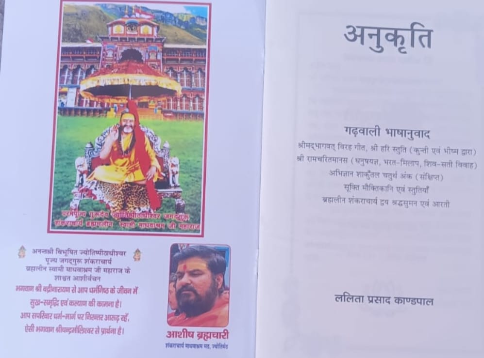 इस मौके पर श्री उनियाल ने कथा ब्यास पंडित नीरज शास्त्री के पिताश्री ललिता प्रसाद कांडपाल द्वारा गढ़वाली भाषा मे लिखी पुस्तक “अनुकृति”का विमोचन किया, और ज्योतिषपीठ बद्रीकाश्रम की ओर से कथा ब्यास को सम्मान पत्र भेंट किया।