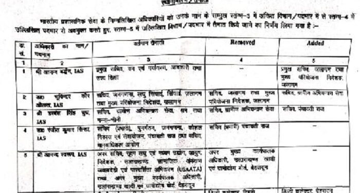 देहरादून। कार्मिक विभाग ने छह आईएएस और सोलह पीसीएस अफसरों का स्थानांतरण किया है। कार्मिक विभाग द्वारा जारी सूची के अनुसार आईएएस अधिकारी आनंद बर्द्धन के वर्तमान विभागों के साथ प्रमुख सचिव जलागम एवं मुख्य परियोजना निदेशक जलागम की जिम्मेदारी भी सौंपी गई है।