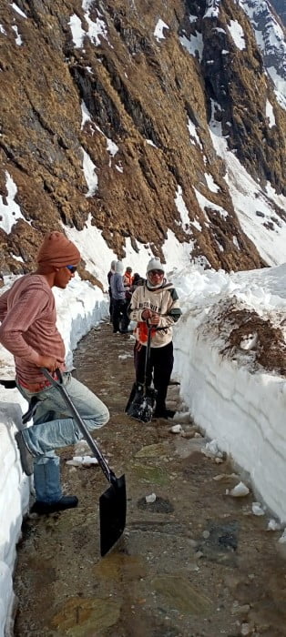गौरीकुण्ड.केदारनाथ पैदल मार्ग पर बर्फ हटाने का कार्य युद्ध स्तर पर जारी है तथा कल तक केदारनाथ धाम तक पैदल मार्ग से बर्फ हटाकर केदारनाथ धाम तक आवाजाही सुचारू होने की संभावना है। पैदल मार्ग से बर्फ हटाने के लिए डीडीएम द्वारा लगभग 140 मजदूरों को लगाया गया है जबकि घोड़े.खच्चरों का पंजीकरण जारी है तथा पैदल मार्ग पर दुकानों के आवंटन के लिए स्थानीय लोगों द्वारा दस्तावेज जमा किये जा रहे है!