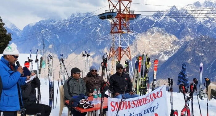 औली मे पहली बार स्नो सूज लाॅचिंग के मौके पर मौजूद मुख्य अतिथि एसडीएम चन्याल व अन्य ।