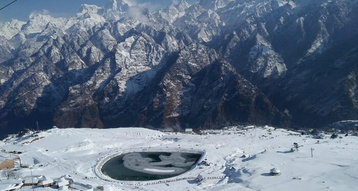 फोटो–बर्फबारी के बाद हिमक्रीडा केन्द्र औली मे निर्मित कृतिम झील का विंहगम दृष्य ।