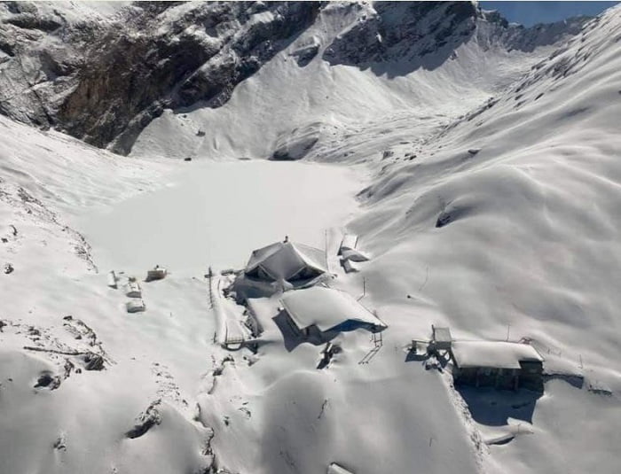 02-चार दिन पूर्व हेलीकाफ्टर से लिया गया हेमकुंड साहिब का दृश्य।