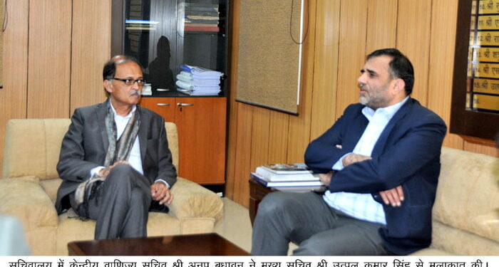 देहरादून। बुधवार को सचिवालय में केन्द्रीय वाणिज्य सचिव श्री अनूप बधावन नेे मुख्य सचिव श्री उत्पल कुमार सिंह से मुलाकात की। तथा प्रदेश की एक्सपोर्ट दर बढाने के संबंध में विचार विमर्श किया।