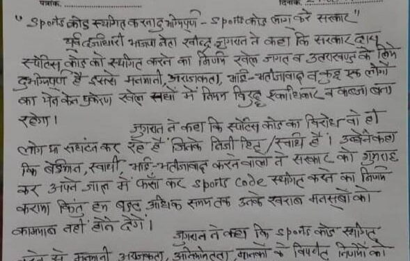 एक विज्ञप्ति में जुगरान ने कहा कि स्पोट्र्स कोड का विरोध वही लोग और संगठन कर रहे हैं, जिनके निजी हित प्रभावित हो रहे हैं। उन्होंने कहा कि बेईमान, स्वार्थी, भाई भतीजावाद करने वाले सरकार को गुमराह कर अपने जाल में फंसा रहे हैं। स्पोट्र्स कोड खत्म करने निर्णय ऐसे लोगों के ही बहकावे में हुआ है, लेकिन ऐसा नहीं होने दिया जाएगा। उन्होंने कहा कि राज्य सरकार को चाहिए कि स्पोट्र्स कोड स्थगित करने के अपने निर्णय पर पुनर्विचार करे। स्पोट्र्स कोड लागू होना खेल जगत के लिए बेहतर निर्णय होगा।