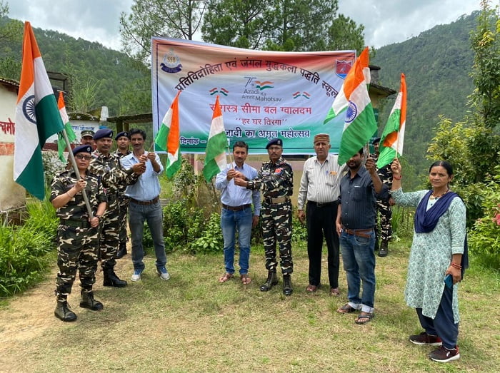 ग्वालदम के निकटवर्ती गांव चिड़िगा मल्ला में हर घर तिरंगा कार्यक्रम के तहत एसएसबी ग्लावदम के निरीक्षक ज्ञान चंद के नेतृत्व में जवानों एवं जूनियर हाईस्कूल में छात्रों एवं ग्रामीणों के तिरंगों का वितरण करते हुए 15 अगस्त को अपने घरों में तिरंगा फहराने की अपील करते हुए फ्लेग कोड आॅफ इंडिया के संबंध में विस्तार से जानकारी दी गई।इस अवसर पर ग्रामीणों एवं छात्रों से तिरंगा फहराने के लिए एक प्रतिज्ञा प्रपत्र पर हस्ताक्षर भी करवाएं। इसी दौरान बद्रीनाथ वन प्रभाग गोपेश्वर के अंतर्गत मध्य पिंडर रेंज थराली के डिप्टी रेंजर माखन लाल एवं एसएसबी के निरीक्षक मुनेंद्र शाह के नेतृत्व में एक वृहद वृक्षारोपण कार्यक्रम का भी यहां पर आयोजित किया गया। जिसमें 615 फलदार, चारापत्ती एवं छायादार पौधों का रोपण कर इनके संरक्षण का संकल्प लिया गया।