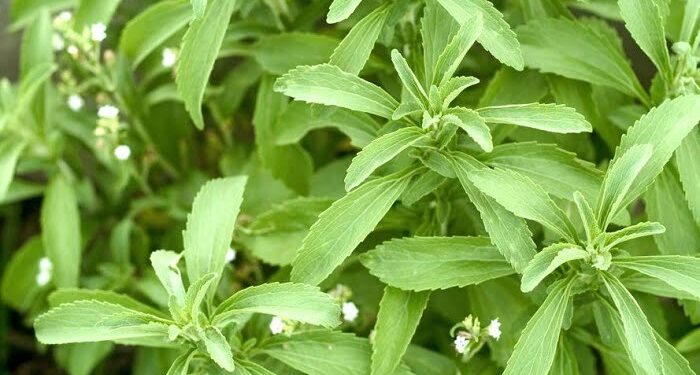 स्टेविया माने मीठी तुलसी, सूरजमुखी परिवार एस्टरेसिया के झाड़ी और जड़ी बूटी के लगभग 240 प्रजातियों में पाया जाने वाला एक जीनस है, जो पश्चिमी उत्तर अमेरिका से लेकर दक्षिण अमेरिका के उष्णकटिबंधीय और उपोष्णकटिबंधीय क्षेत्रों में पाया जाता है। स्टेविया रेबउडियाना प्रजातियां, जिन्हें आमतौर पर स्वीटलीफ, स्वीट लीफ, सुगरलीफ या सिर्फ स्टेविया के नाम से जाना जाता है, मीठी पत्तियों के लिए वृहत मात्रा में उगाया जाता है। स्वीटनर और चीनी स्थानापन्न के रूप में स्टेविया, चीनी की तुलना में धीरे.धीरे मिठास उत्पन्न करता है और ज्यादा देर तक रहता है, हालांकि उच्च सांद्रता में इसके कुछ सार का स्वाद कड़वापन या खाने के बाद मुलैठी के समान हो सकता है। इसके सार की मिठास चीनी की मिठास से 300 गुणा अधिक मीठी होती है, न्यून.कार्बोहाइड्रेट, न्यून.शर्करा के लिए एक विकल्प के रूप में बढ़ती मांग के साथ स्टेविया का संग्रह किया जा रहा है।