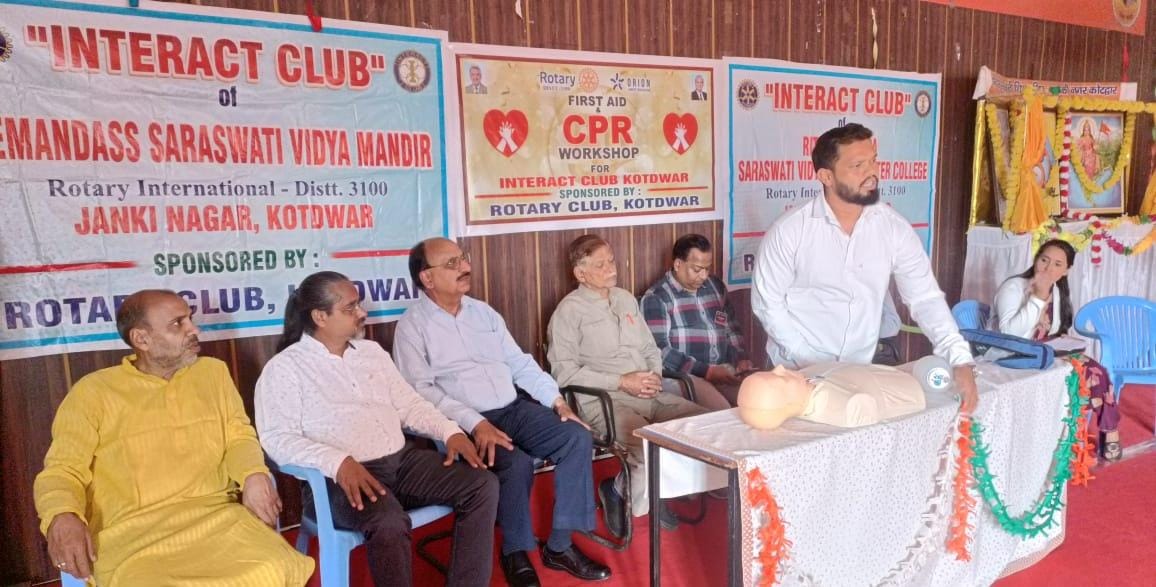 कोटद्वार। रोटरी क्लब के तत्वावधान में इन्ट्रेक्ट क्लब रितेश शर्मा सरस्वती विद्या मन्दिर इण्टर कालेज जानकीनगर के छात्र-छात्राओं को फर्स्ट एड एवं सी पी आर के सम्बन्ध में जानकारी देने हेतु एक कार्यशाला का आयोजन किया गया।