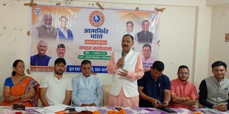 डोईवाला (प्रियांशु सक्सेना)। आत्मनिर्भर भारत संकल्प के तहत भाजपा डोईवाला मंडल की ओर से नगर क्षेत्र के भानियावाला में कार्यशाला का आयोजन किया गया। कार्यक्रम का शुभारंभ महापुरुषों के चित्रों पर दीप प्रज्वलन कर किया गया। कार्यशाला में भाजपा कार्यकर्ताओं ने स्वदेशी, कौशल विकास और आत्मनिर्भर भारत को जनआंदोलन बनाने का संकल्प लिया।