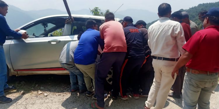 जनपद रुद्रप्रयाग के दिगधार बडंमा के पास अचानक एक कार सड़क के किनारे जा गिरी,सूचना मिलते ही आपदा प्रबंधन टीम डीडीआरएफ बसुकेदार के जवान तुरंत घटना स्थल पहुँचे ओर स्थानीय लोगो की मदद से कार व चालक को सकुशल निकाला गया, आपदा प्रबन्धन अधिकारी नन्दन सिंह रजवार ने बताया कि चालक मोबाइल पर बात कर रहा था जिसके चलते गाड़ी अनियंत्रित होकर सड़क किनारे जा गिरी, गनीमत रही कि बड़ा हादसा होने से बच गया. आपदा प्रबन्धन अधिकारी ने लोगो से अपील की है कि गाड़ी चलाते समय फोन का इस्तेमाल ना करे जरूरी हो तो गाड़ी साइड पर खड़ी करके ही मोबाईल पर बात करे.