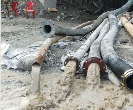 01- सुरंग से पंपों के द्वारा निकलता पानी ।