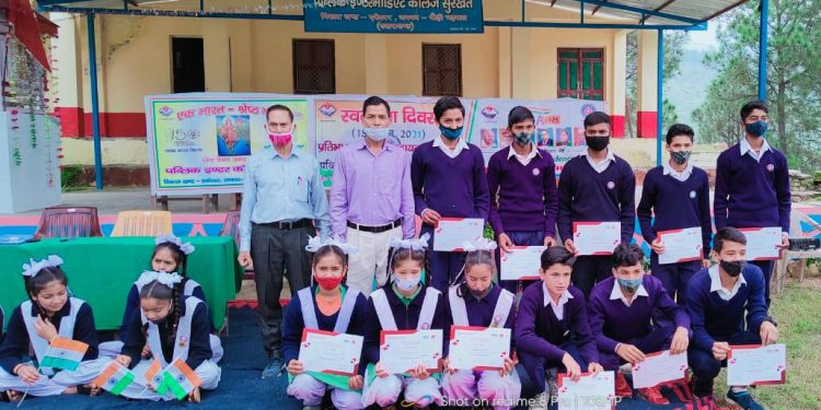 कमल बिष्ट।कोटद्वार। पब्लिक इंटर कॉलेज सुरखेत में 75वां स्वाधीनता दिवस तिरंगा यात्रा के साथ हर्षोल्लास पूर्वक मनाया गया। कार्यक्रम का शुभारंभ प्रधानाचार्य हीरा सिंह तोमर द्वारा ध्वजारोहण के साथ किया गया। देश की स्वतंत्रता के लिए संघर्ष और प्राणों का बलिदान करने वाले अमर सेनानियों का भावपूर्ण स्मरण करके उन्हें श्रद्धांजलि दी गई। हिन्दी के प्रवक्ता सतीश चंद्र शाह ने विद्यालयी शिक्षा उत्तराखंड के महानिदेशक बंशीधर तिवारी का विद्यालयों के नाम स्वाधीनता दिवस संदेश पढ़कर सुनाया।