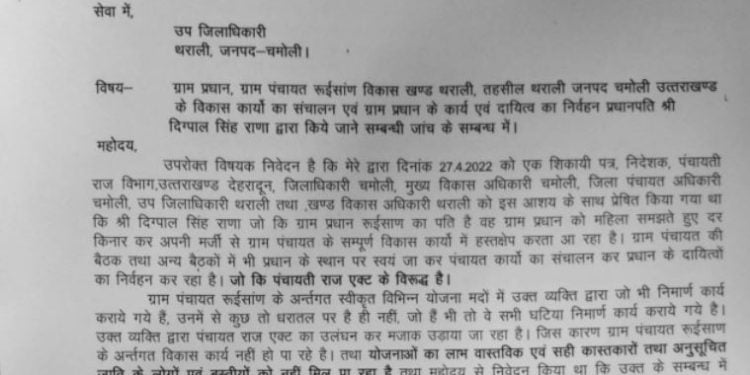 दरअसल 24 अप्रैल को इस ब्लाक के रूईसाण गांव की सामाजिक कार्यकर्ता पार्वती सोलियाल ने गांव के प्रधानपति पर ग्रामीण रोजगार के विकास कार्यों सहित पंचायत से संबंधित अन्य कार्यों में अनावश्यक हस्तक्षेप करने का आरोप लगाते हुए इस संबंध में पंचायतीराज निदेशक, जिलाधिकारी,सीडीओं चमोली सहित एसडीएम व खंड विकास अधिकारी को एक शिकायती पत्र भेज कर जांच की मांग की थी।जिस पर बीडीओ थराली ने एसडीओ पंचायत थराली को मामले में जांच करने के निर्देश दिए। पर्वती देवी ने पुनः एक पत्र एसडीएम एवं बीडीओ थराली को भेजे एक पत्र में कहा हैं,कि उच्चाधिकारियों के निर्देश पर जांच अधिकारी आरोपों की जांच के लिए 19 मई को गांव में तों गए किन्तु उनके द्वारा ना ही शिकायतकर्ता को इसकी जानकारी दी और ना ही उन्होंने ग्रामीणों की सूनी।