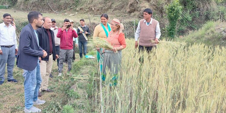 पौड़ी। जिलाधिकारी गढ़वाल डॉ0 आशीष चौहान ने आज जिले में फसलों की औसत उपज और उत्पादन के आंकड़े संकलन को लेकर तहसील पौड़ी के अन्तर्गत ग्राम पंचायत डूंगरी में गेहूं की फसल पर की जा रही क्रॉप कटिंग का जायजा लिया। राजस्व विभाग ने डूंगरी गांव के कृषक ध्रुव सिंह के गेहूं के खेत में 30 वर्ग मीटर का प्लाट बनाकर सीसीई एग्री ऐप के माध्यम से क्रॉप कटिंग का प्रयोग किया। जिसमे 8 किलो 550 ग्राम गेहूं की फसल प्राप्त हुई।