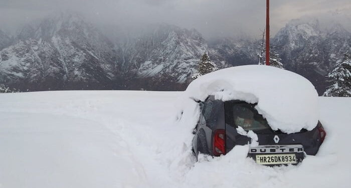 फोटो– औली पार्किगं में बर्फ में फॅसे पर्यटकों के वाहन ।