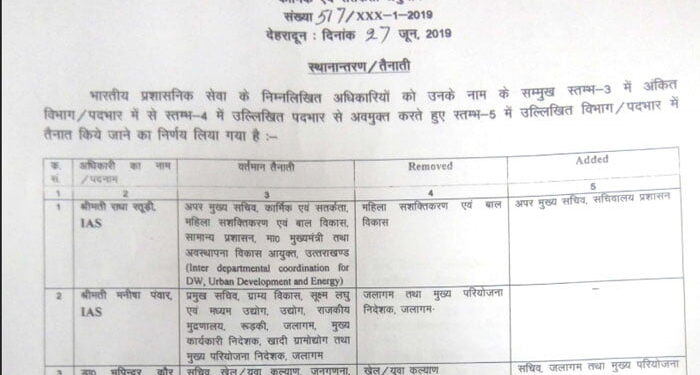 डी सेंथिल पांडियन से सचिव कृषि शिक्षा, कृषि एवं कृषि विपणन, उद्यान, गन्ना चीनी, पंचायतीराज एवं मुख्य परियोजना निदेशक प्रोजेक्ट कोआर्डिनेटर आईएलएसपी, प्रोजेक्ट डायरेक्टर यूजीवीएस समेत सभी पदों से अवमुक्त किया गया है। दिलीप जावलकर को गढ़वाल मंडल कमिश्नर का अतिरिक्त दायित्व दिया गया है। सचिव सौजन्या को महिला सशक्तिीकरण एवं बाल विकास विभाग सौंपा गया है। हरवंश चुध को सचिव गन्ना, चीनी की अतिरिक्त जिम्मेदारी सौंपी गई है। प्रभारी सचिव ब्रजेश कुमार संत से खनन विभाग वापस लिया गया है, जबकि उन्हें सचिव प्रभारी खेल, युवा कल्याण एवं निदेशक खेल एवं युवा कल्याण की जिम्मेदारी सौंपी गई है। डा.रंजीत कुमार सिन्हा को सचिव प्रभारी पंचायतीराज तथा मुख्या परियोजना निदेशक आईएलएसपी, प्रोजेक्ट डायरेक्टर यूजीवीएस की जिम्मेदारी सौंपी गई है।