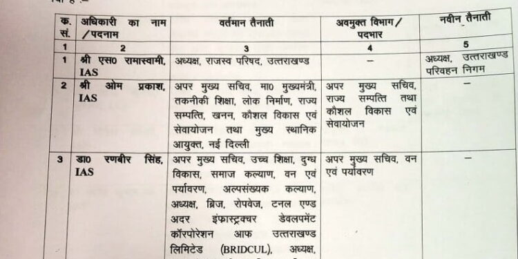 कार्मिक विभाग द्वारा जारी सूची के अनुसार पूर्व मुख्य सचिव एस रामास्वामी को अध्यक्ष परिवहन निगम की जिम्मेदारी सौंपी गई है, उनके पास पहले से ही अध्यक्ष राजस्व परिषद का कार्यभार है। अपर मुख्य सचिव ओम प्रकाश से अपर मुख्य सचिव राज्य संपत्ति, कौशल विकास एवं सेवायोजन का कार्यभार वापस लिया गया है। अपर मुख्य सचिव डा.रणवीर सिंह से अपर मुख्य सचिव वन एवं पर्यावरण का कार्यभार वापस लिया गया है। प्रमुख सचिव मनीषा पंवार से महानिदेशक/आयुक्त उद्योग, उत्तराखंड का कार्यभार वापस लिया गया है।