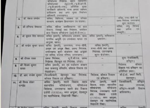 विनय शंकर पांडे को जिलाधिकारी हरिद्वार उपाध्यक्ष हरिद्वार-रुड़की विकास प्राधिकरण का उपाध्यक्ष भी बनाया गया है। हरिद्वार के जिलाधिकारी सी रविशंकर को अपर सचिव वित्त चिकित्सा, चिकित्सा शिक्षा तथा महानिदेशक चिकित्सा शिक्षा की जिम्मेदारी सौंपी गई है। पिथौरागढ़ के जिलाधिकारी रहे आनंद स्वरूप को अपर सचिव ग्राम्य विकास, आयुक्त ग्राम्य विकास तथा निबंधक सहकारिता की जिम्मेदारी सौंपी गई है। आशीष चैहान को जिलाधिकारी पिथौरागढ़ बनाया गया है। सुश्री वंदना सिंह को जिलाधिकारी अल्मोड़ा की जिम्मेदारी सौंपी गई है, अल्मोड़ा के जिलाधिकारी रहे नितिन भदौरिया को अपर सचिव पेयजल एवं मिशन निदेशक जल जीवन मिशन ग्रामीण की जिम्मेदारी सौंपी गई है। हिमांशु खुराना को जिलाधिकारी चमोली की जिम्मेदारी सौंपी गई है, चमोली की जिलाधिकारी रही स्वाति भदौरिया को अपर सचिव नागरिक उड्डयन/संस्कृति, प्रबंध निदेशक जीएमवीएन, मुख्य कार्यकारी अधिकारी उकाडा तथा महानिदेशक संस्कृति की जिम्मेदारी सौंपी गई है।